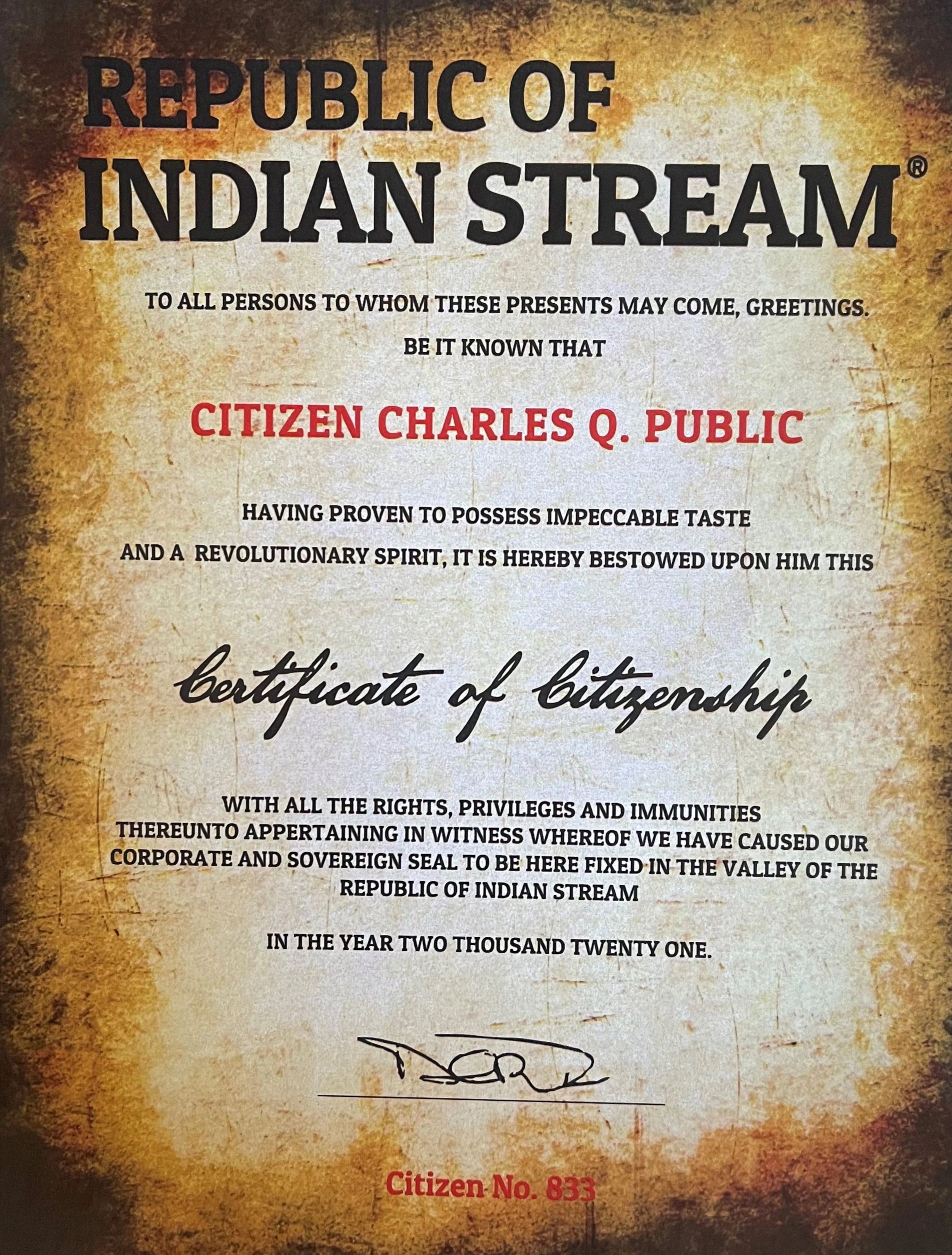 We honor the unique history of the Republic of Indian Stream. Those folks were tough, cool, and uniquely American - until they decided to leave America to create their own sovereign nation: